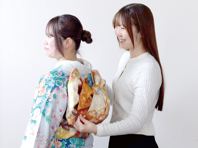 帯結びのバリエーションや補正の方法、美しく着せるための体型補整など、活躍の幅を広げる専門技術を習得します。 -