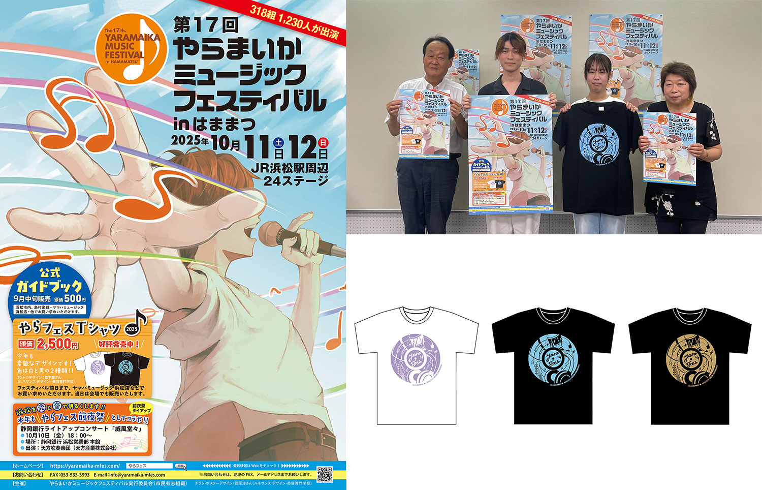 デザインコンペ(ポスターデザインとTシャツデザイン)受賞&採用10月11日(土)、12日(日)に浜松駅前で開催される音楽イベント「第17回やらまいかミュージックフェスティバル in はままつ」のデザインコンペ(ポスターデザインとTシャツデザイン)で、ポスターデザインでデザイン専攻2年生の学生が最優秀賞、Tシャツデザインでも1年生の学生が最優秀賞を受賞し、それぞれイベントでの採用が決定しました!