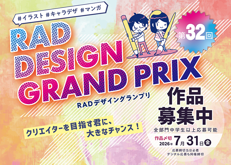 現在、第32回RADデザイングランプリの作品を募集中です!32回目となる今回も「イラストレーション」「キャラクターデザイン」「マンガ」「ハガキ」の4部門で作品を受け付けます!